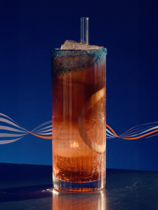 ● Highball-Glas Rand mit Orangensaft benetzen, in blaues Spirulina-Pulver tauchen