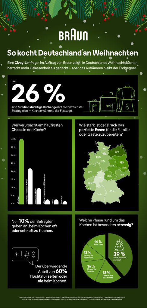 (Neu-Isenburg, 9. Dezember 2025) Wenn an Weihnachten Deutschlands Küchen auf Hochtouren laufen, steigt nicht überall automatisch der Puls. Zwar fühlt sich rund jeder fünfte Deutsche unter Druck gesetzt, ein perfektes Festtagsessen zu servieren, doch laut einer repräsentativen Umfrage von Civey im Auftrag von Braun* mit 5.000 Befragten zeigt sich: Die größte Belastung entsteht nicht beim Kochen selbst – eine Tätigkeit, die moderne Braun Küchengeräte mit vielfältigem Zubehör erleichtern –, sondern beim anschließenden Aufräumen.