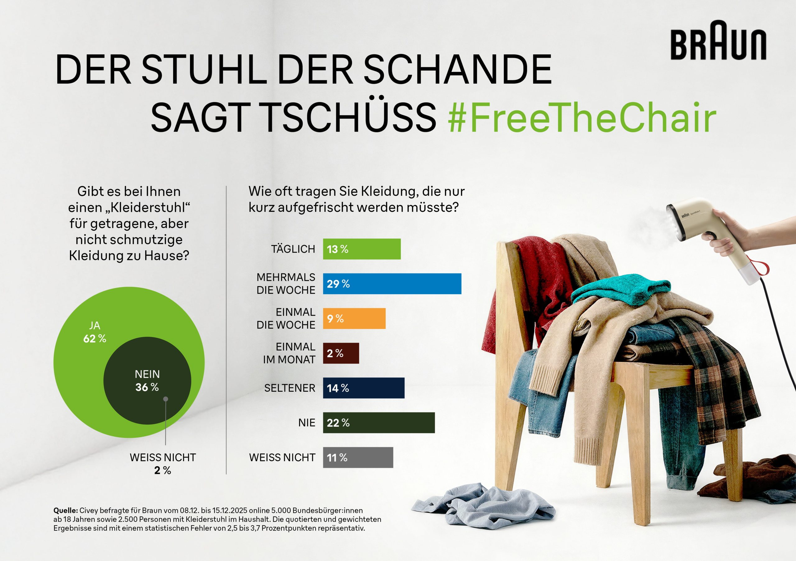 Civey hat im Auftrag von Braun Household vom 5. bis 15. Dezember 2025 online 5.000 Bundesbürger:innen ab 18 Jahren befragt, darunter 2.500 Personen mit einem sogenannten Kleiderstuhl im Haushalt. Die Ergebnisse sind aufgrund von Quotierungen und Gewichtungen repräsentativ unter Berücksichtigung eines statistischen Fehlers von 2,5 bis 3,7 Prozentpunkten beim jeweiligen Gesamtergebnis.