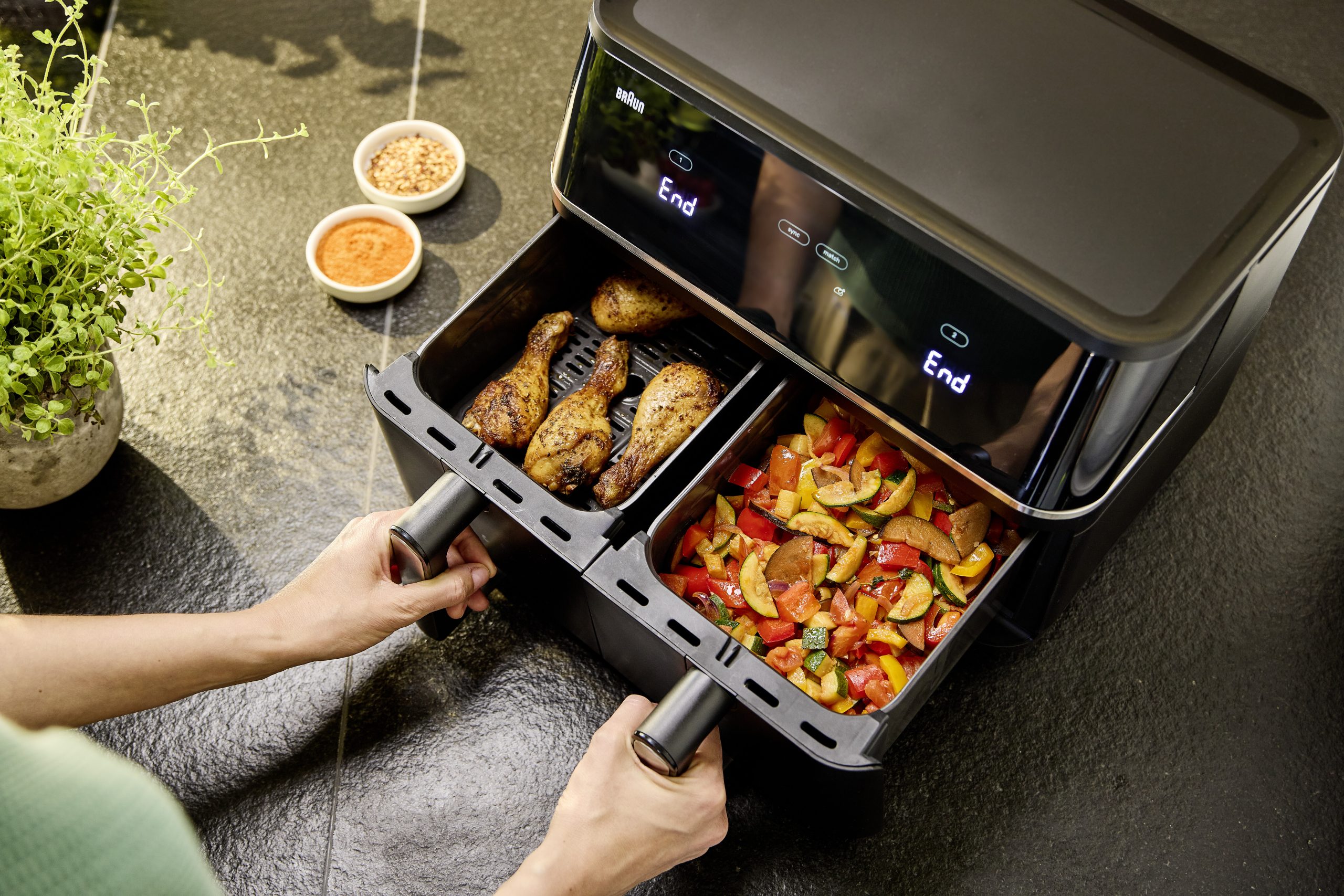 Wer größere Mengen zubereiten möchte, profitiert von der Match-Funktion: Sie ist darauf ausgelegt, identische Speisen parallel in beiden Garkörben zuzubereiten. Per Match-Taste werden Temperatur und Zeit für beide Garkörbe automatisch synchronisiert. Die Sync Funktion übernimmt zudem das Timing: Mit nur einem Knopfdruck werden die Programme so abgestimmt, dass beide Gerichte gleichzeitig fertig sind, auch bei unterschiedlichen Zubereitungszeiten.