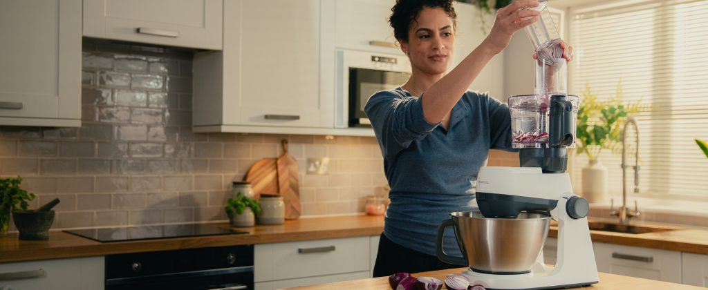 Bei der Entwicklung des KHC30 stand die intuitive Handhabung im Fokus. Das Ergebnis ist ein Gerät, das mit durchdachten Details und ergonomischen Finessen überzeugt. Dank des innovativen Entriegelungsmechanismus lässt sich der Rührarm mühelos mit nur einer Hand bedienen. Die hochwertige Edelstahlschüssel verfügt über einen ergonomischen Griff, der sowohl Links- als auch Rechtshändern ein komfortables Schwenken und Ausgießen ermöglicht. Der nahezu rundum schließende Spritzschutz sorgt für eine saubere Arbeitsfläche. Besonderer Clou: Ein praktischer Messlöffel ist direkt im Design verbaut – so sind zusätzliche Utensilien beim Abmessen hinfällig. Auch das Problem unordentlicher Küchenschubladen gehört der Vergangenheit an, da sich die Rührelemente platzsparend und jederzeit griffbereit direkt in einer integrierten Aufbewahrung am Gerät verstauen lassen. Auch beim Thema Lautstärke punktet der Multi Tasker, denn er arbeitet spürbar leiser als sein Vorgänger Prospero Plus KHC29, was besonders in offenen Wohnküchen und Familienhaushalten ein echtes Plus ist. Und wer beim Kauf auch an morgen denkt, darf sich freuen, schließlich ist fast die Hälfte des verbauten Kunststoffs recycelt.