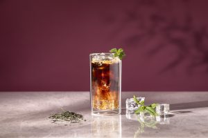 ● Eiswürfel ins Glas, danach Cold Brew und Minztee dazugeben.